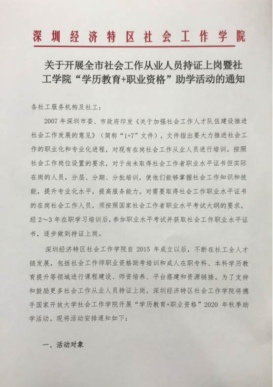 关于开展全市社会工作从业人员持证上岗暨社工学院 “学历教育+职业资格” 助学活动的通知
