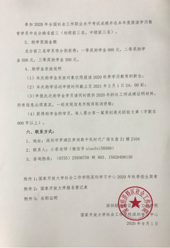 附件1:国家开放大学社会工作学院深圳学习中心2020年秋季招生简章
