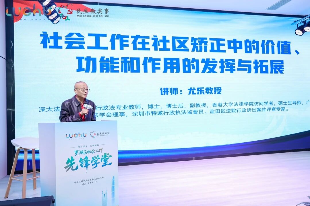 随后,深圳大学法学院尤乐副教授围绕“社会工作在社区矫正中的价值、功能和作用的发挥与拓展”展开专业分享,深刻剖析社矫工作在社会治理格局中的核心地位。