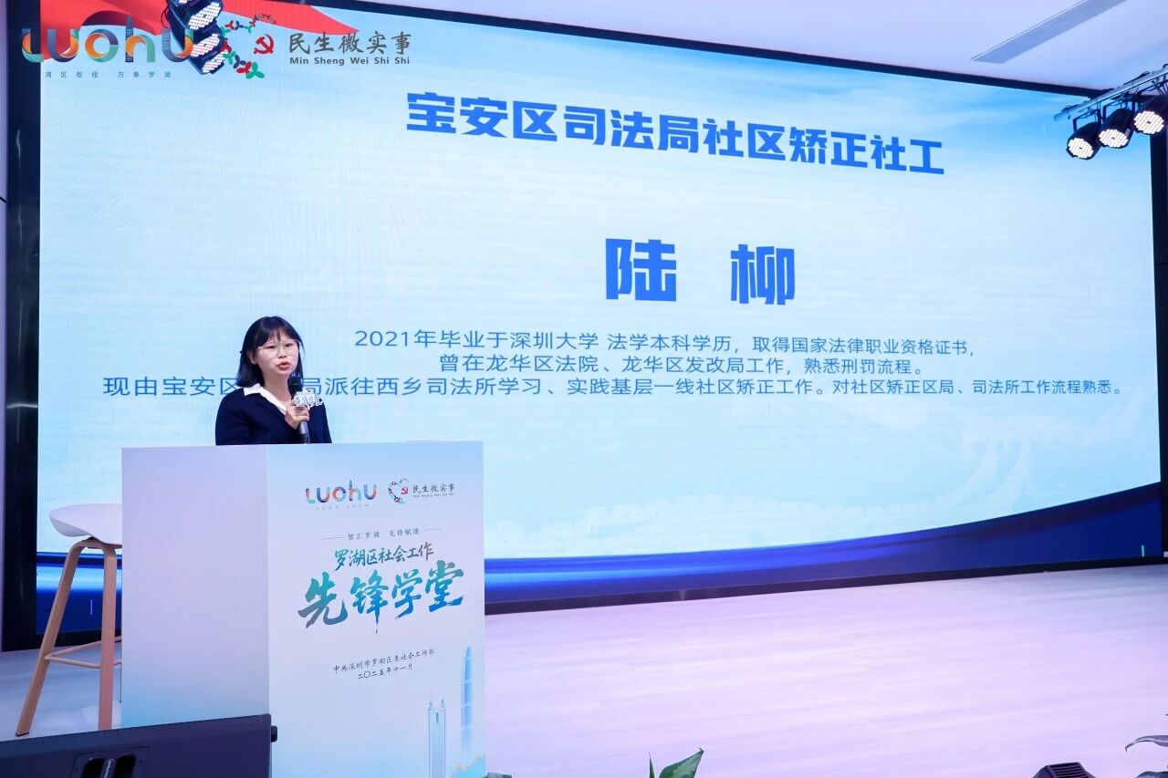 在基层司法社矫代表分享环节,深圳市罗湖区指南针社工服务中心社矫法务专员王思洁聚焦“以法治人才赋能社区矫正”主题,详解深圳市“社区矫正专员”模式的打造与推广经验;
