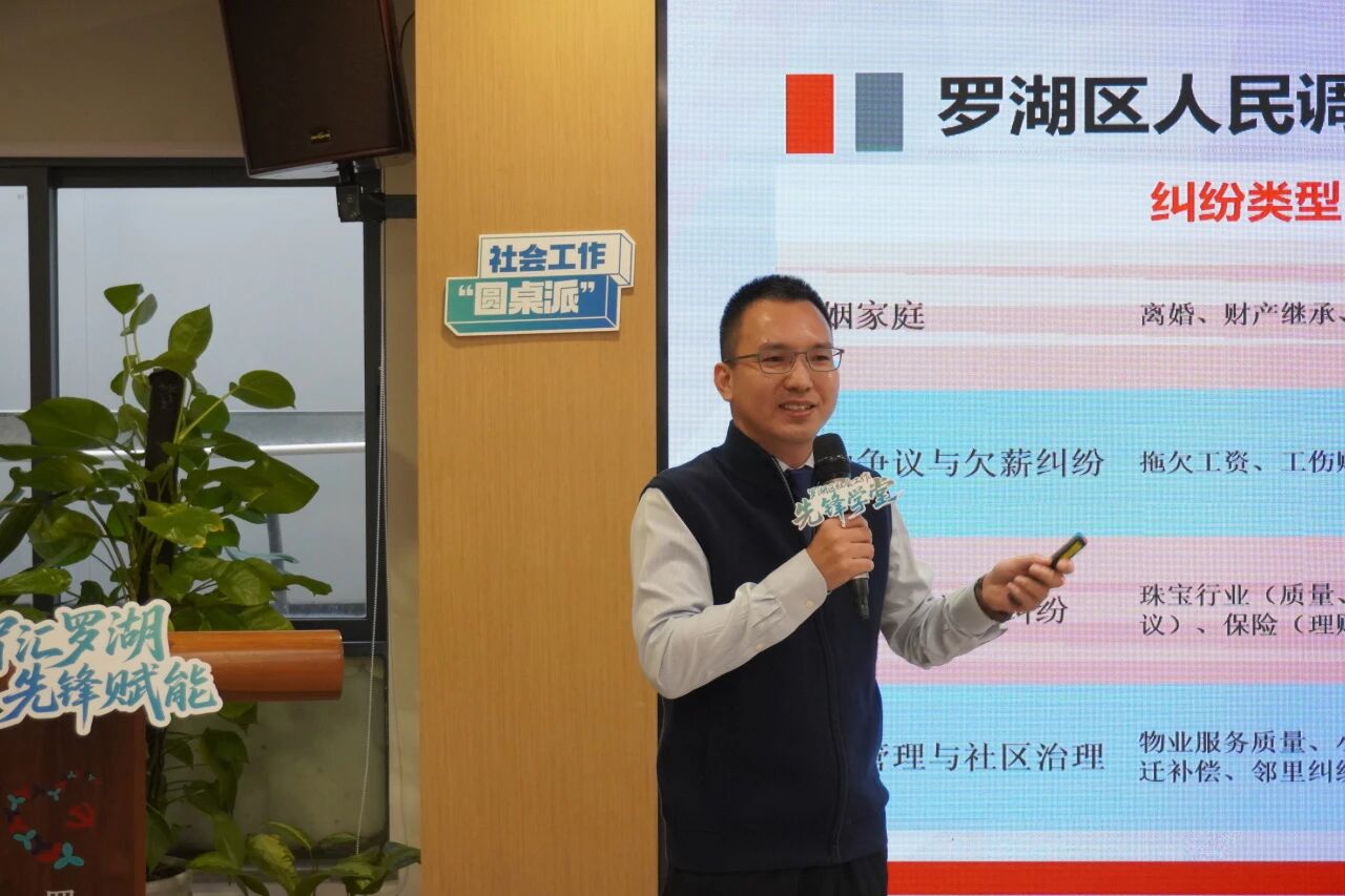 为了进一步推动罗湖区矛盾纠纷调解的升级,维护辖区和谐稳定、提升民生幸福指数,筑牢基层治理防线,11月27日上午,由中共深圳市罗湖区委社会工作部主办、深圳经济特区社会工作院承办、深圳市新现代社工服务中心协办的“罗湖区社会工作先锋学堂第四期圆桌交流派”在罗湖区党群服务中心二楼新时代大讲堂顺利举行。本次活动以“多元协同·精准解纷——罗湖区矛盾纠纷调解体系优化与实践创新”为主题,汇聚政法系统、社区党委、社会组织、法律实务等多方专家,共同探讨基层矛盾纠纷调解的体系构建与实践路径。