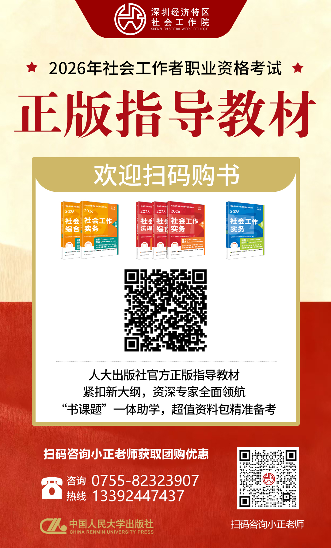 为方便考生购书,我院同步发售中国人民大学出版社2026年社会工作师考试教材,考生扫描下方二维码购买,团购可联系小正老师。