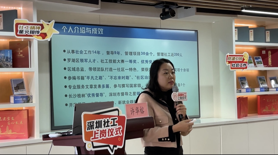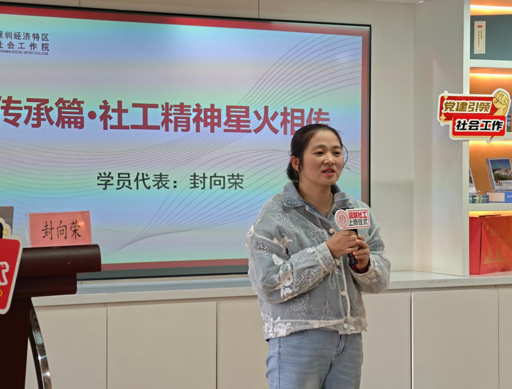 我院副院长周燕琼主持本次上岗仪式,现场行业前辈的分享与引领成为最动人的篇章。深圳市社会工作者协会副秘书长李锋讲授《党建引领深圳社会工作高质量发展》,系统梳理了深圳社工18年专业化、职业化建设的发展脉络——从2007年率先出“1+7”文件奠定政策基础,到2024年初市委社会工作部成立开启行业发展新阶段,深入解读了在中社部、民政部、省委社工部等上级部门指导及市委市政府领导下,深圳如何逐步建立起具有本土特色的现代社会工作体系。同时,李锋副秘书长聚焦党建引领的核心要求,重点阐释了社工行业发展中与新社工紧密相关的关键制度,让新社工深刻领会高质量发展的时代意义。