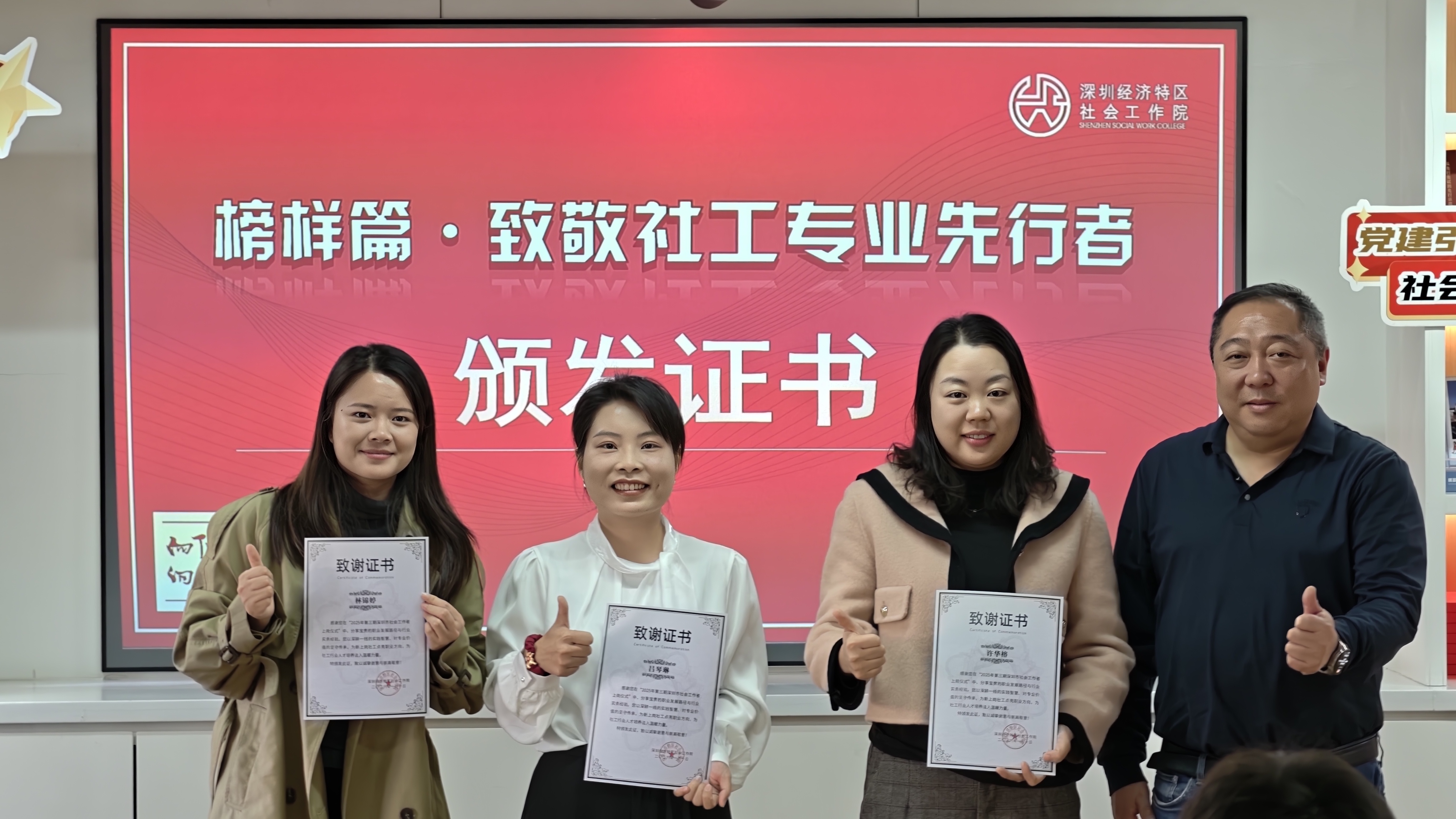 一张张证书见证着成长与蜕变,也标志着职业社工生涯迈入新的阶段。愿各位新社工以今日为起点,怀揣专业知识与赤诚之心,扎根基层、服务群众,用行动诠释“助人自助”的社工精神,在社会工作的广阔天地中发光发热,为深圳社会工作高质量发展添砖加瓦,共同书写社会和谐进步的美好篇章!