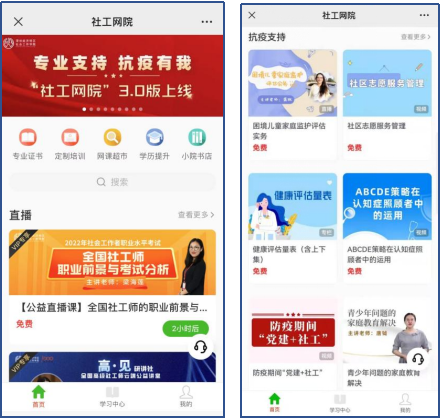自疫情出现以来,基于防控的要求,传统的线下培训及面授教育受到了极大的冲击。深圳社工学院在积极配合国家抗疫工作要求的同时,努力探索并充分利用网络传播的优势,研发了“社工网院”一站式学习平台。“社工网院”平台采取录播、直播、远程教学等多种授课模式,结合随堂测试、在线考试、打卡学习等方式,将继续教育和人才培养重心从线下向线上转移,最大限度地降低疫情防控对教学产生的影响,最大程度地满足各部门及社工在疫情期间的学习和人才培养需求。