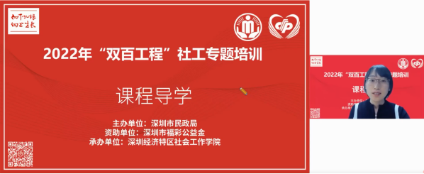 2022年深圳市“双百工程”社工专题培训通过线上和线下相结合的形式开展。8月18日,社工学院教育中心副总监王美云通过“课程导学”的形式,介绍了本年度双百社工专题培训的背景、要求、流程以及相关安排等内容,社工学院将聚焦深圳市双百社工培训需求,结合国内街道社工站建设视野和实践成效,针对性地设计课程内容,开展包含新时期思想政治教育、兜底民生政策法规、社会工作职业伦理规范、社会工作实务能力提升、“双百”社工专项能力提升工作坊、“双百工程”社工岗前培训等系列学习内容。