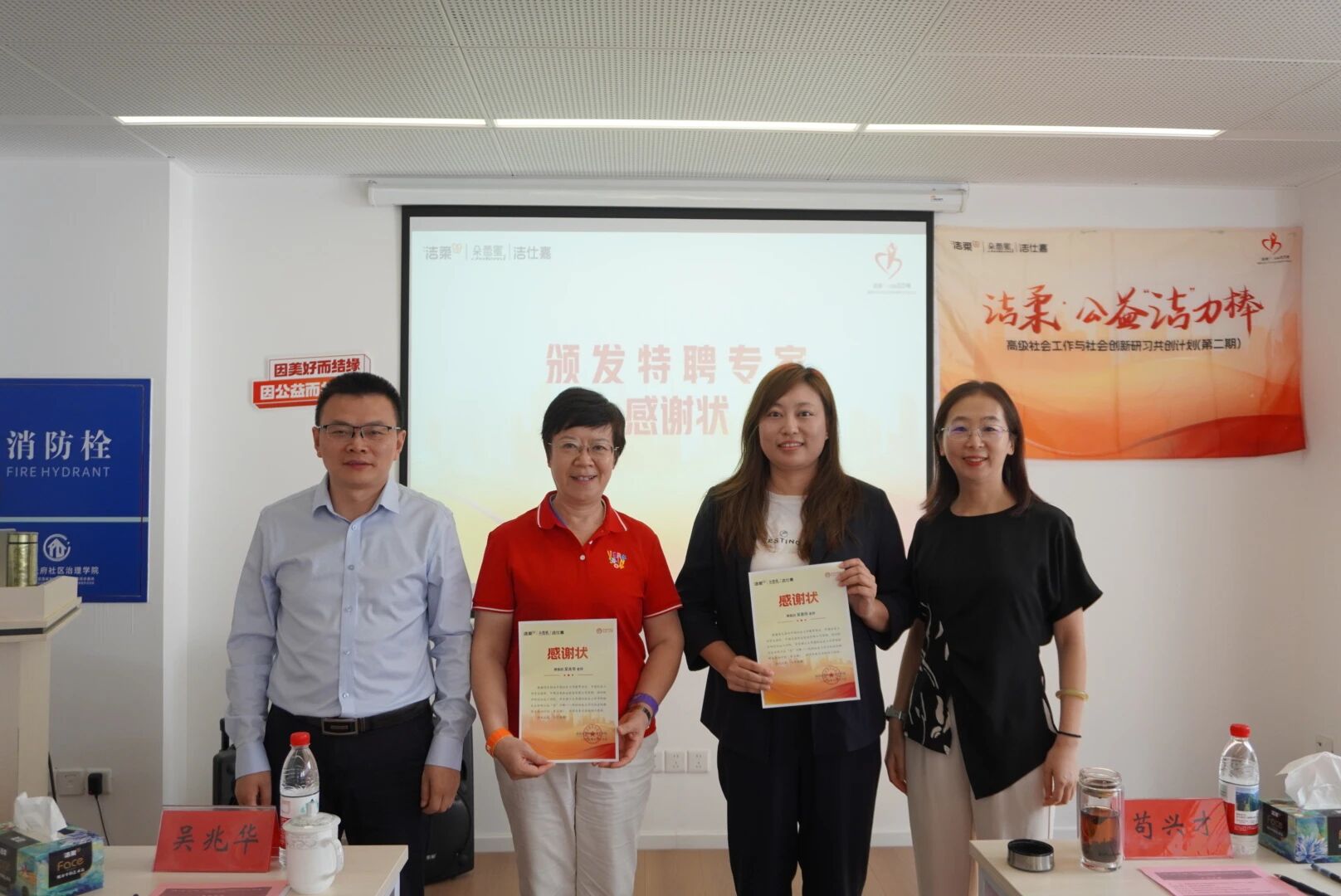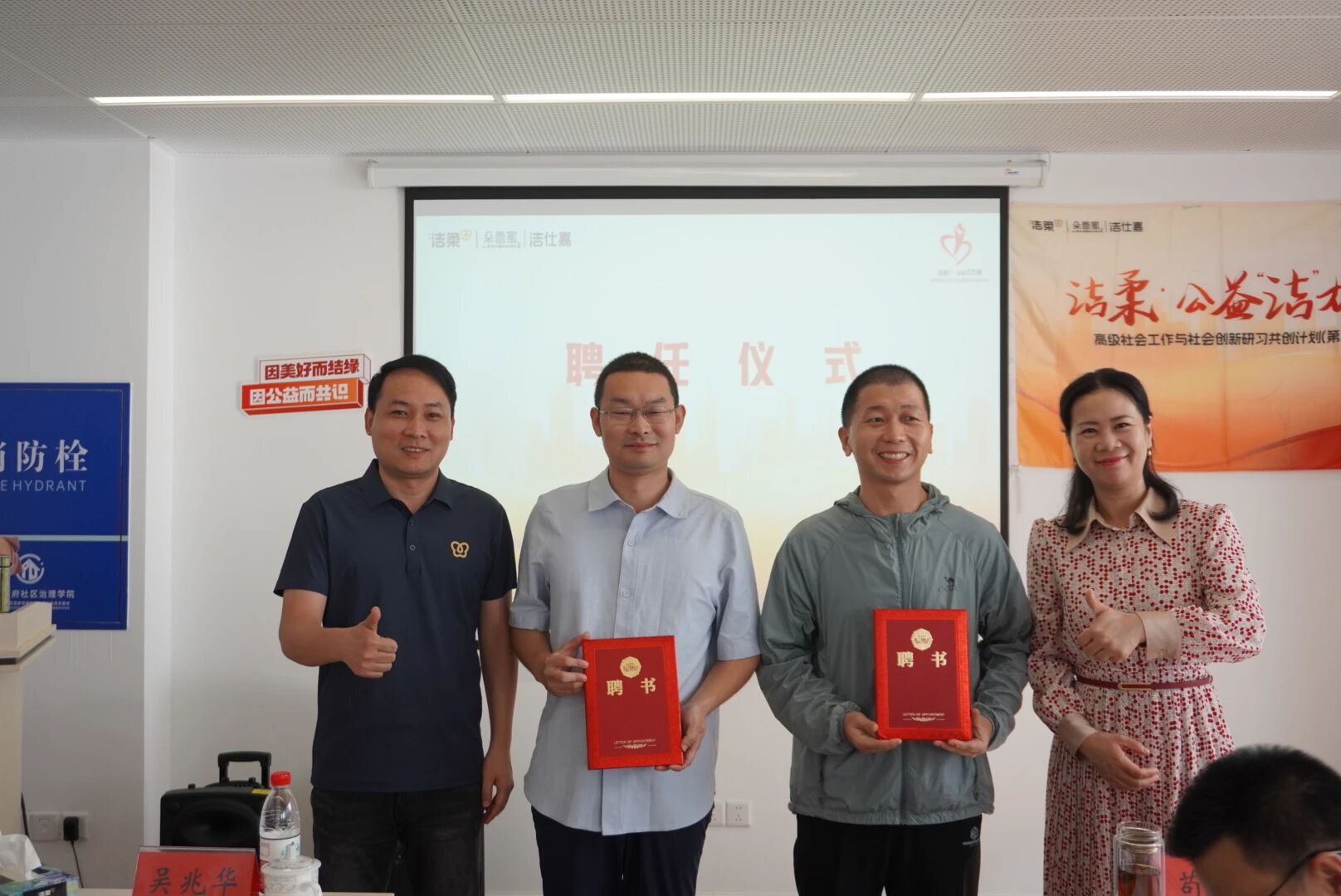 紧接着,中顺洁柔纸业股份有限公司公关总监陈华荣和深圳经济特区社会工作院监事刘锦秀为邢宇宙、聂祝兵颁发二期项目导师聘书,期待他们能引领学员们在研习共创中取得优异成果。这些荣誉的颁发,不仅是对专家和导师们的认可,更是为整个计划树立了榜样,激励着更多人投身到社会工作事业中。