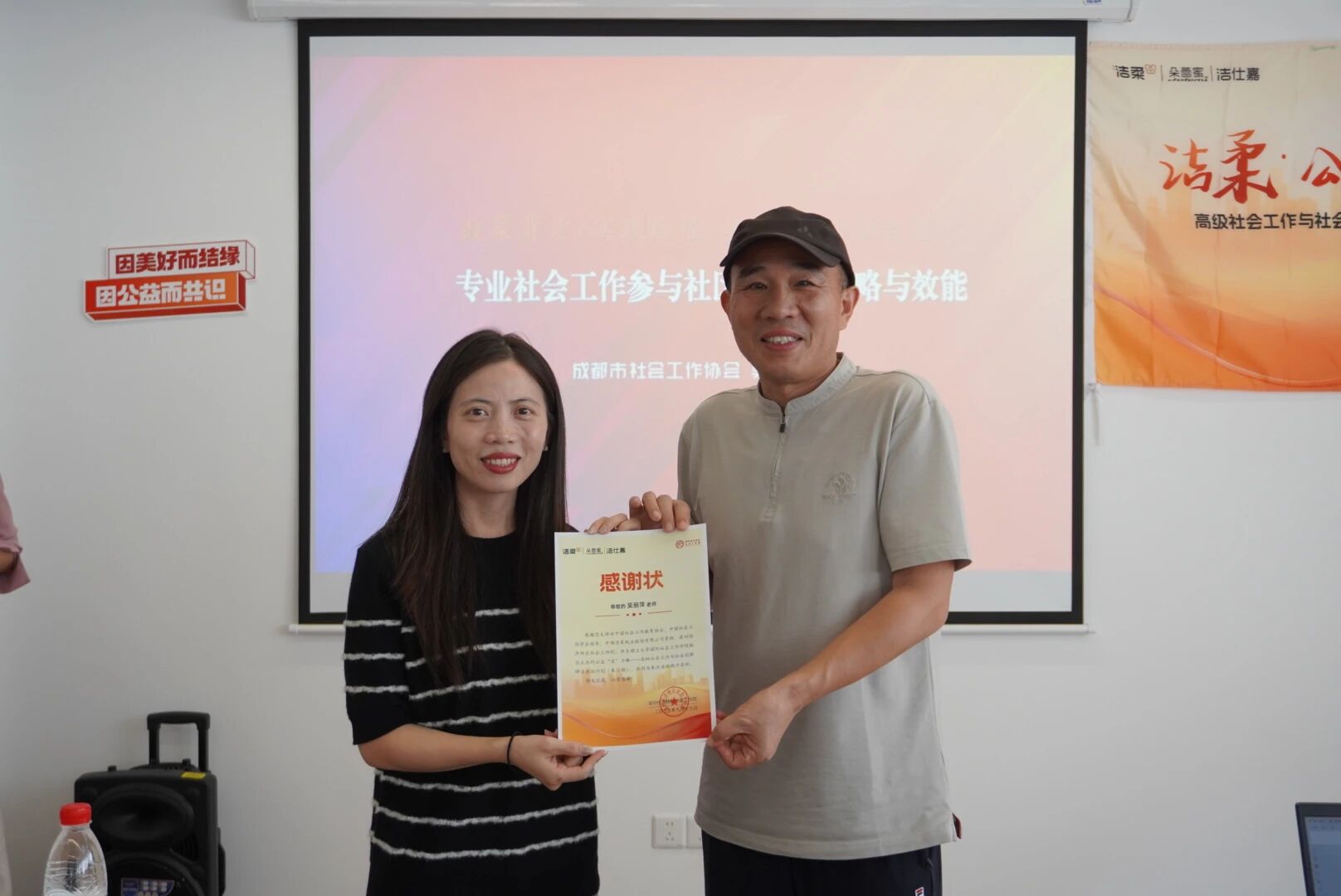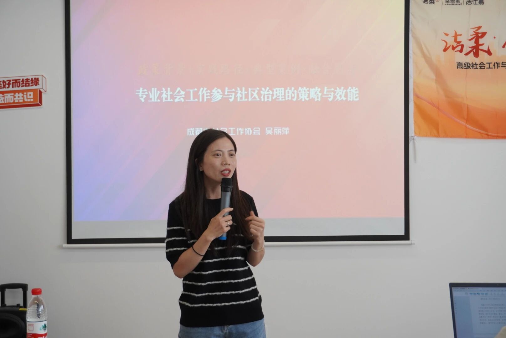 成都市社会工作协会秘书长吴丽萍进行了主题为《社会工作参与社区治理的策略与效能》的分享。她通过实际案例,展示了社会工作在社区治理中的有效方法和显著成效,为学员们提供了宝贵的实践思路。