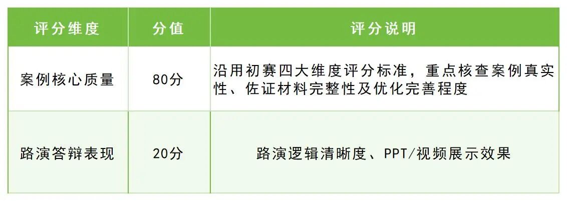 采取线上形式进行 ,由评委参考评分标准,从适配性、创新性、实操性、价值性4个方面对参赛案例进行打分,按每个领域取前3名的原则确定晋级决赛项目,共15个项目晋级。晋级结果将通过线上答疑群及短信形式通知参赛人员。