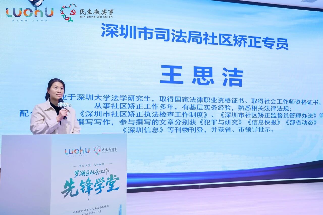 在基层司法社矫代表分享环节,深圳市罗湖区指南针社工服务中心社矫法务专员王思洁聚焦“以法治人才赋能社区矫正”主题,详解深圳市“社区矫正专员”模式的打造与推广经验;