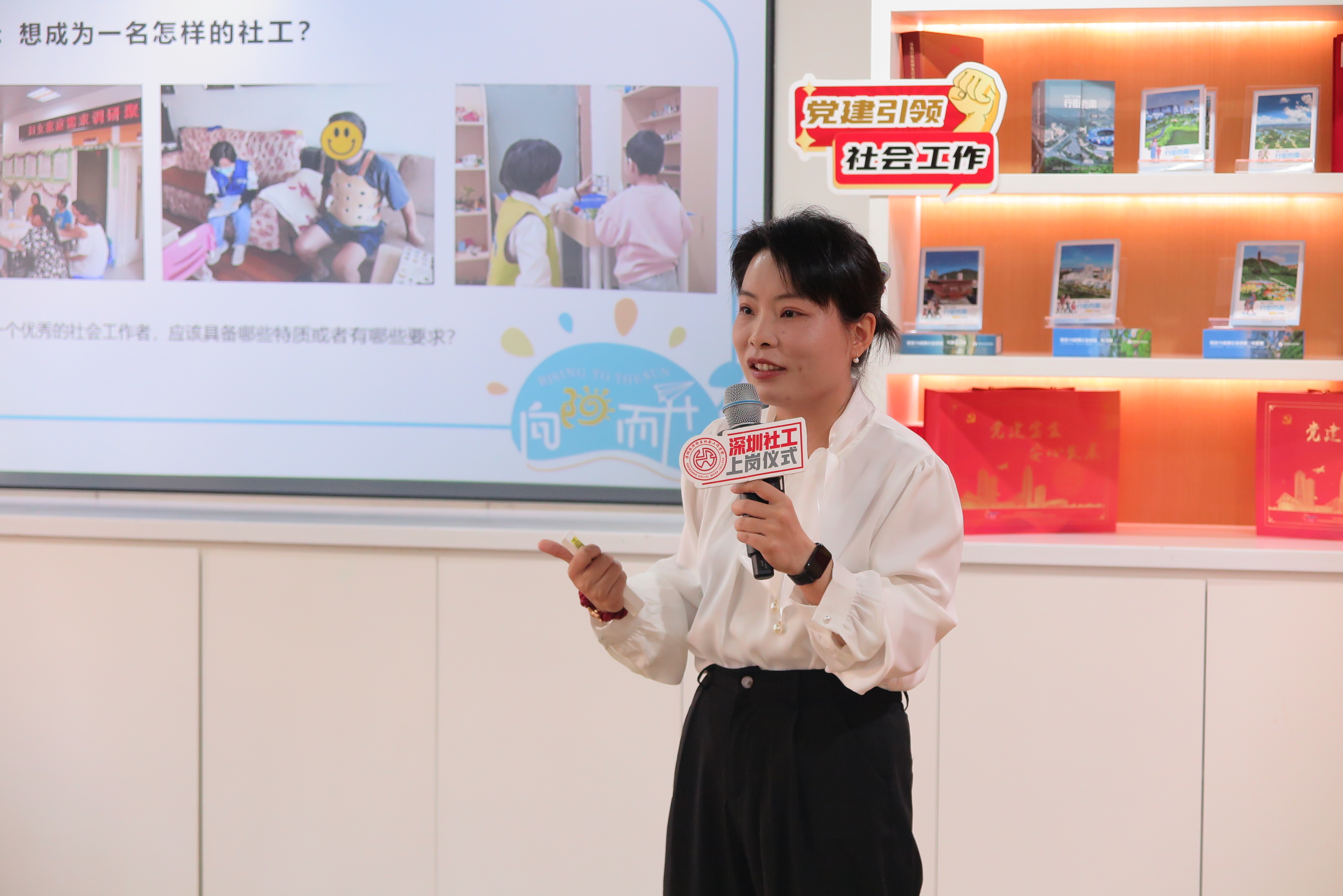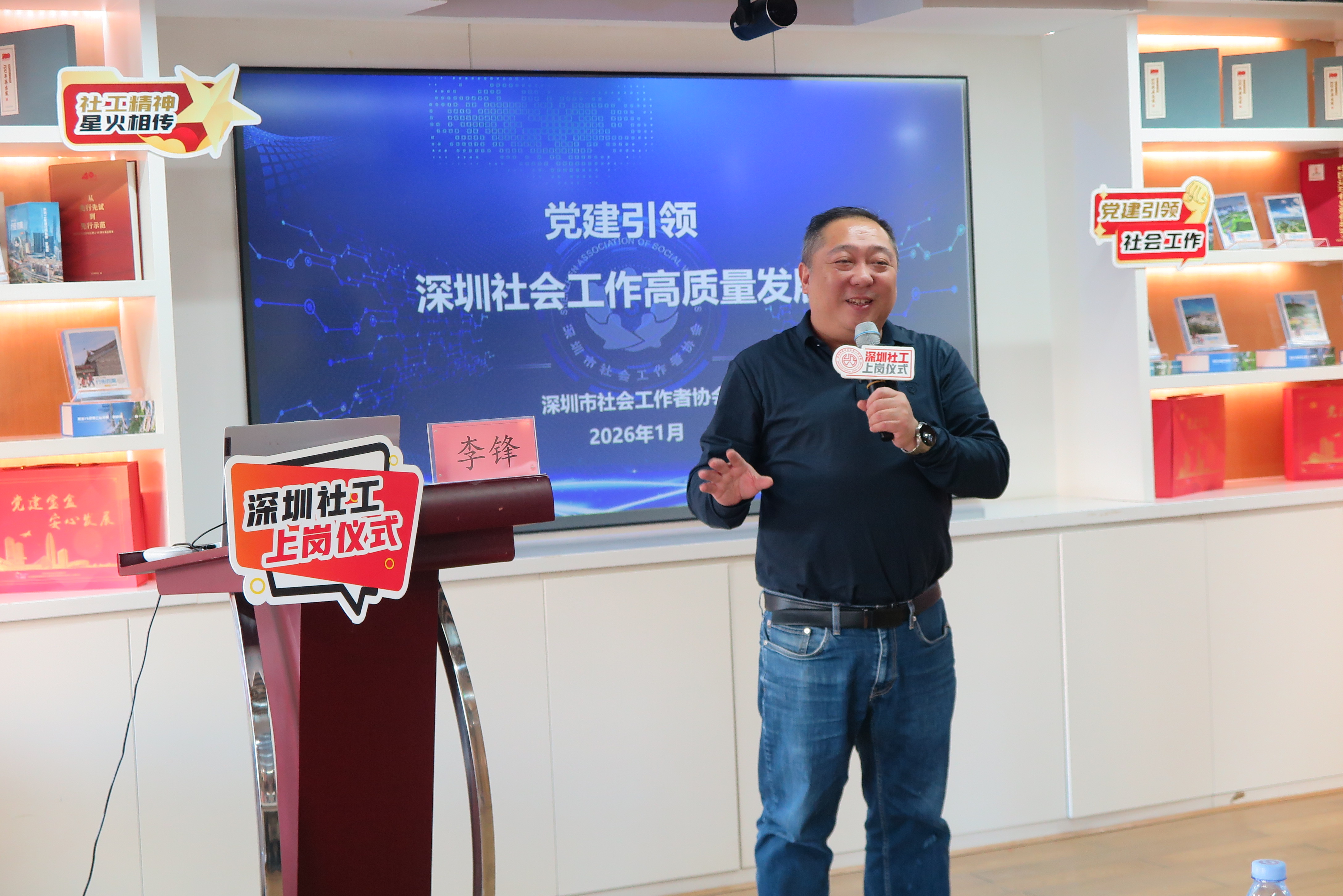 我院副院长周燕琼主持本次上岗仪式,现场行业前辈的分享与引领成为最动人的篇章。深圳市社会工作者协会副秘书长李锋讲授《党建引领深圳社会工作高质量发展》,系统梳理了深圳社工18年专业化、职业化建设的发展脉络——从2007年率先出“1+7”文件奠定政策基础,到2024年初市委社会工作部成立开启行业发展新阶段,深入解读了在中社部、民政部、省委社工部等上级部门指导及市委市政府领导下,深圳如何逐步建立起具有本土特色的现代社会工作体系。同时,李锋副秘书长聚焦党建引领的核心要求,重点阐释了社工行业发展中与新社工紧密相关的关键制度,让新社工深刻领会高质量发展的时代意义。