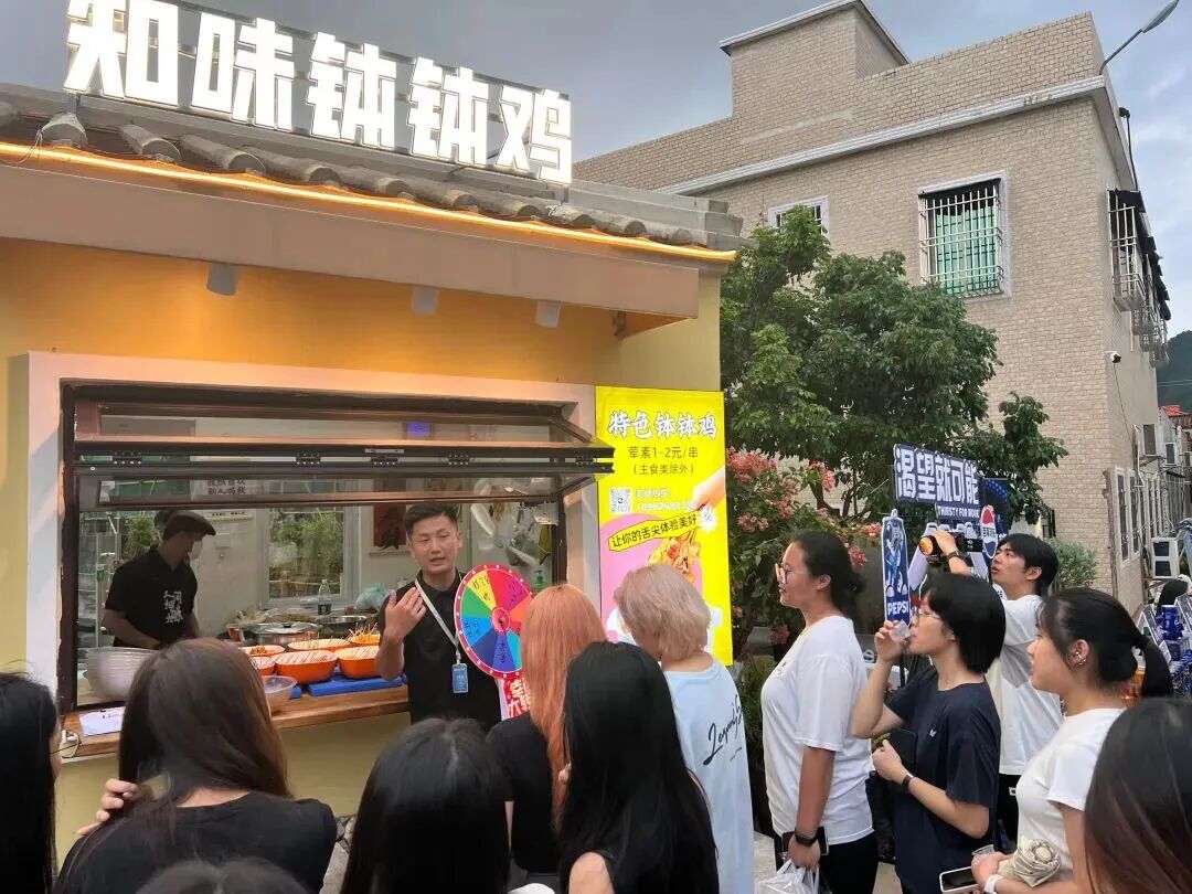 午后的青创市集更是热闹非凡,16时30分,随着主持人宣布开业,“新生礼·共生市集”正式迎客。提前通过华师校内公众号、社团及班级群得知消息的师生们纷纷到场,凭关注抖音号领取诚意满满的“新生礼盒”——内含象征“故事的种子”的新北村主题原石、闯关游戏入场券、商户优惠券、手绘地图与明信片,还有小红书打卡任务卡,福利满满。市集内,手工糕点、现榨果汁、海鲜小吃、文创产品等摊位前人头攒动,商户们精心准备了试吃活动,工作人员组织游客以6-8人为一组,开启趣味闯关之旅,在各个摊位间品尝美食、参与娱乐挑战。广场上设置的“在新北,遇见另一种生活”主题背景板与“写给青创市集的一句话”学生留言墙,成为热门打卡点,师生们拍照后发布小红书或抖音,带上#新北村青创市集开业啦 话题,就能兑换精美礼品。此外,百事可乐专区的机器狗互动表演与任意消费抽奖盲盒活动,更是让现场氛围持续升温,欢声笑语不断。