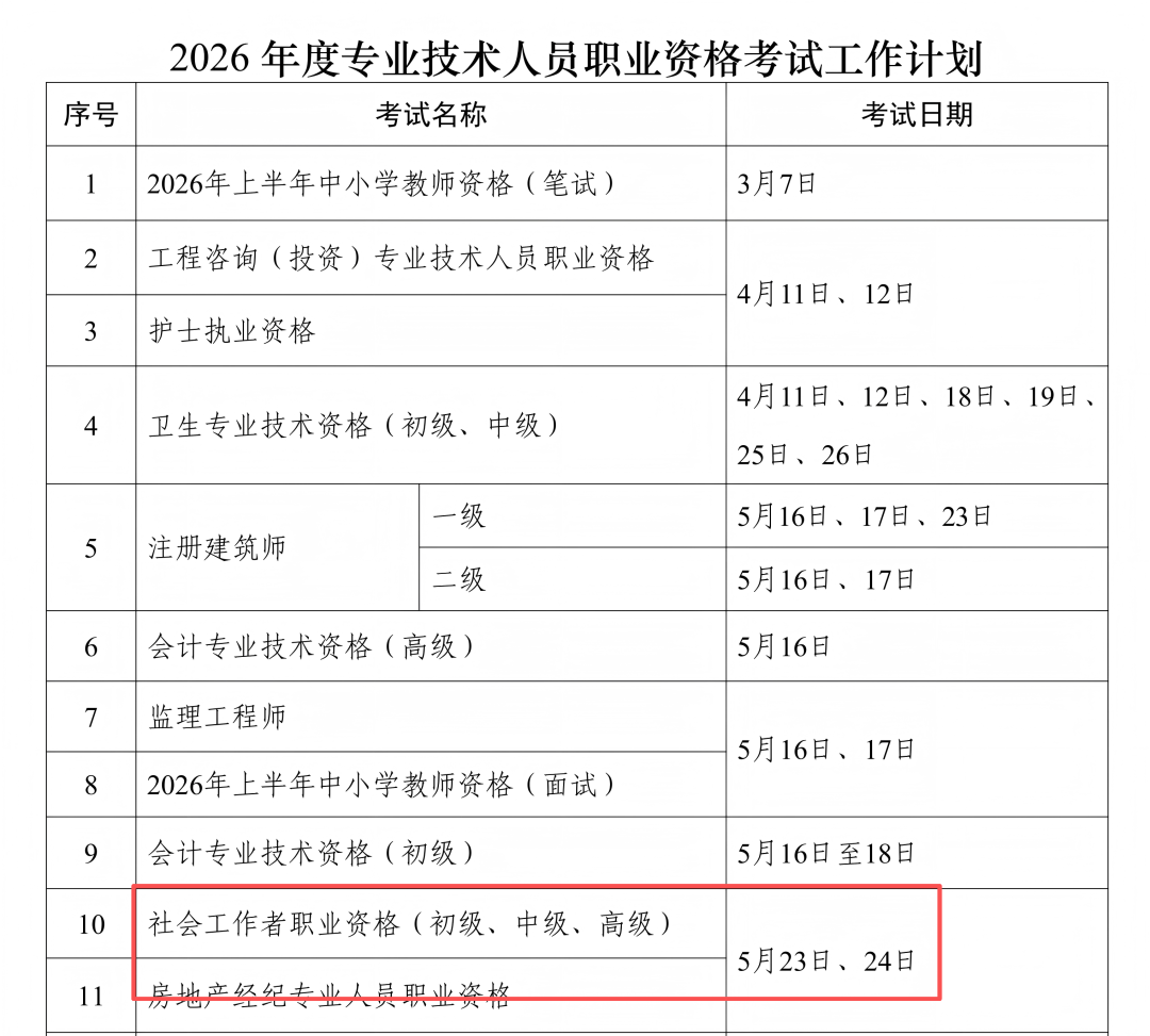 为切实做好专业技术人员职业资格考试规划与管理工作,方便广大专业技术人员参加职业资格考试,经征求有关部门同意,现就2026年度专业技术人员职业资格考试工作计划及有关事项通知如下: