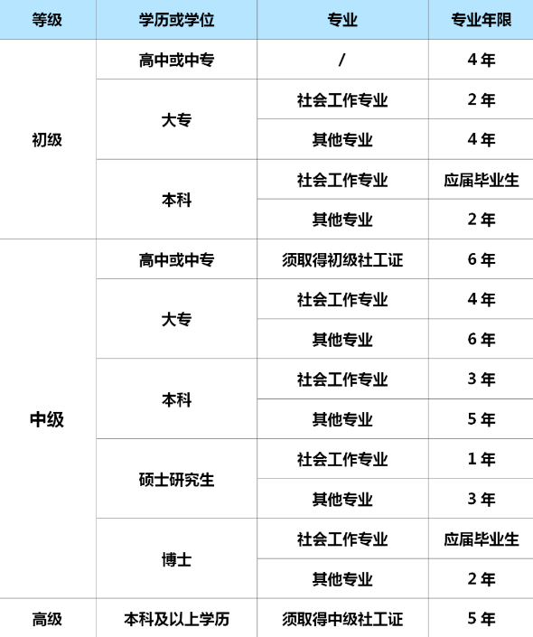 中级(社工师):《综合能力(中级)》+《法规与政策》+《实务(中级)》,客观题 + 主观题,连续 2 个年度通过三科取证